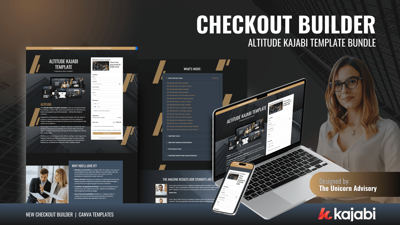 Your absolute template collection comes with the following Kajabi templates in Altitude design: